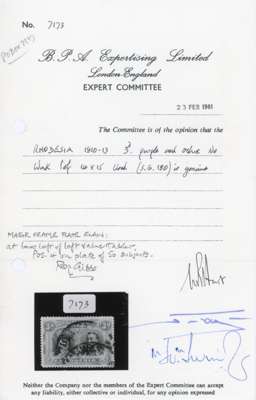 1910-13 3d purple and ochre, perf 14x15, pos. 4 with ‘semaphore’ flaw by left value tablet, used with two part Bulawayo cancels, trivial corner crease but very scarce. BPA cert (1981). SG 180, RSC I
