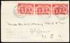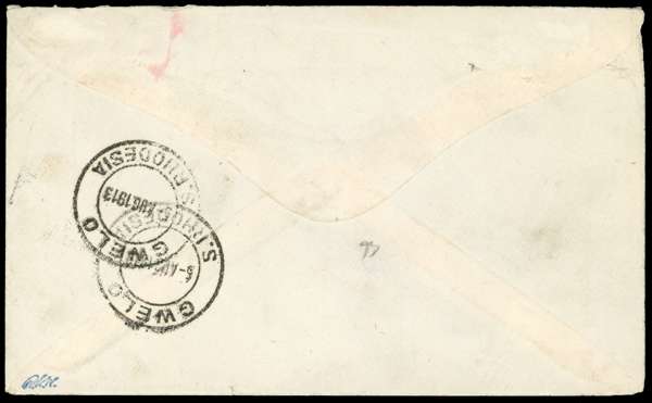 1913 (5 AUG) cover from Lalapanzi to USA, franked by 1910-13 1d carmine-red x3 (SG 124) tied by individual fine to very fine strikes of ‘LALAPANZI / S. RHODESIA’ cds (Proud type D2), backstamped at Gwelo (5 AUG) with recipient's arrival ds (SEP 8) at lower left, a fine usage.