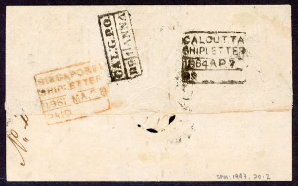 1864 (MR 28) entire from Singapore to Calcutta, franked by India 1856-66 1a brown tied by “B-172” octagon and m/s “Stamped”, the reverse with fine to very fine strikes of boxed “SINGAPORE / SHIP LETTER / PAID” (Proud type SL3, in red), “CALCUTTA / SHIP LETTER” and “CAL. G.P.O. / BG 1 ANNA” handstamps, the first showing error in year “1861” for “1864”; minor blemishes still fine and scarce.