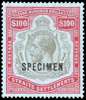 1921-33 $100 black and carmine/blue, Script wmk, opt ‘SPECIMEN’, fresh large part o.g. SG 240cs, cat £1000.