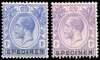 1922 (c.) 1c DLR printer's samples (2) respectively in blue and violet on gummed unwatermarked paper and overprinted ‘SPECIMEN’ (type DS1), toned gum otherwise fine and scarce.