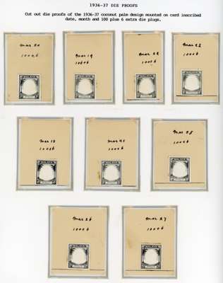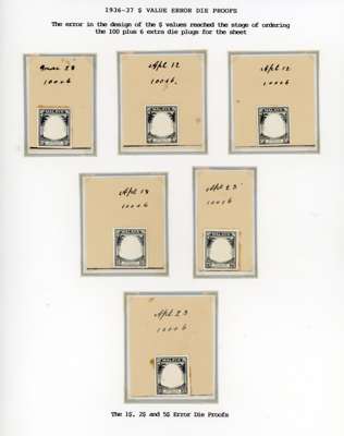 1935 (Mar-Apr) 1c to $5, set of 15 stamp-size frame die proofs in black on glazed card, affixed to individual pieces from the De La Rue day book, dated between 18 March and 23 April and marked ‘100 + 6’, the $1, $2 and $5 exceptionally with the value tablets in the essay design with value before ‘$’; plus a further two pieces, the first affixed with four proofs (1c, 2c, 5c, 8c) dated between 12 and 16 July and marked ‘100’, the second affixed with the three dollar values showing the corrected value tablets ('$1', ‘$2’, ‘$5’) dated between 11 and 24 February 1936 and marked ‘100 + 6’. A wonderful and highly important group, unique in this form. (22 proofs)