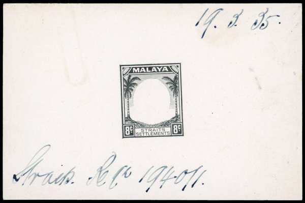 1935 (19 Mar) 8c frame die proof in black on glazed card (92 x 60mm), endorsed ‘Straits Reqn 1940/1’ and foot and dated ‘19.3.35’ at upper right, indentation in surround from paperclip otherwise fine.