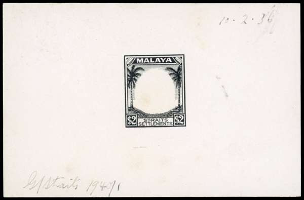 1936 (10 Feb) $2 frame die proof in black on glazed card (92 x 60mm), endorsed ‘G/Straits 1940/1’ at lower left and dated ‘10.2.36’ at upper right, trivial soiling but rare.