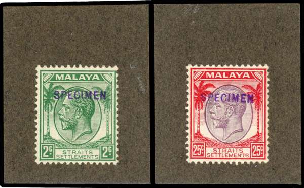 Straits Settlements 1936-37 2c, 25c handstamped Specimen in violet