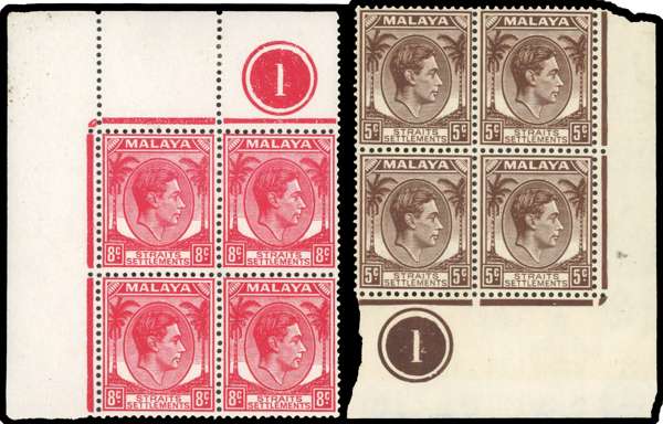 Straits Settlements 1937-41 KGVI set to $5 plate blocks of 4