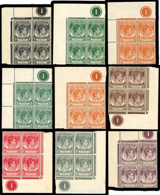 1937-41 set to $5, 19 values less the $2 but inclg 5c die II and unissued 8c scarlet, each as a plate block of 4, large part o.g. with the stamps mainly unmounted, most with light gum toning but a very scarce assemblage. SG 278/98, cat £1700+