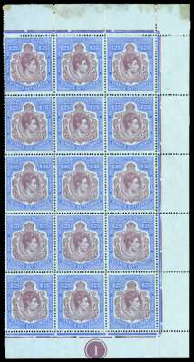Postal Fiscal. 1938 KGVI $25 purple and blue/blue, inscribed ‘REVENUE / REVENUE’, block of 15 (3x5) being the three rightmost columns of a sheet with full margins showing plate number ‘1’, large part o.g. with characteristic streaky brown gum, separation between stamps and margin at right and adhesion on reverse of top row, nevertheless a remarkable and very rare large multiple. SG F1, cat £21000+