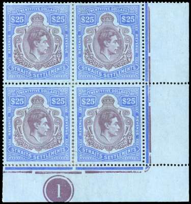 Straits Settlements 1938 KGVI $25 revenue plate block of 4
