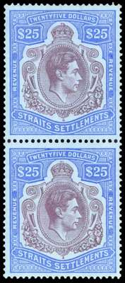 Postal Fiscal. 1938 KGVI $25 purple and blue/blue, inscribed ‘REVENUE / REVENUE’, vertical pair with characteristic streaky brown gum, unmounted o.g. SG F1, cat £2800.