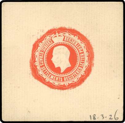 Postal Stationery. 1926 (18 Mar) KGV 15c embossed registered letter stamp proof in orange on laid paper (64 x 63mm) with uncleared surround and dated ‘18.3.26’ at lower right, slight splitting reinforced on reverse, still fine and rare.
