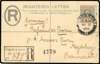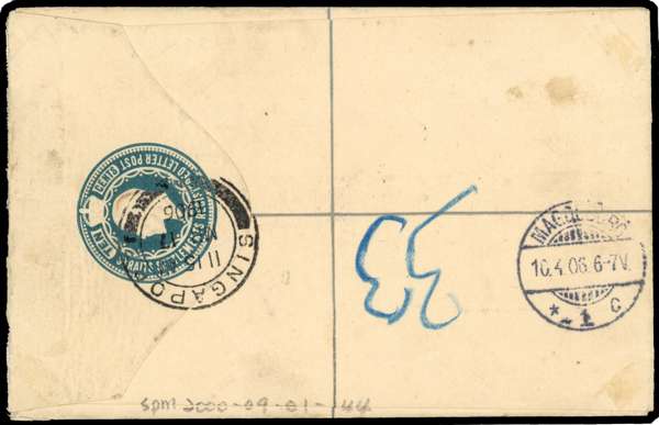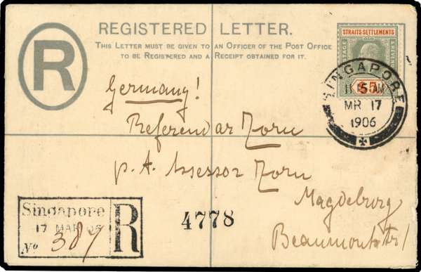 1906 (MR 17) KEVII 10c blue registered postal stationery envelope (size F), addressed to Germany and franked by 1904-10 $5, wmk MCA, ord paper, tied by Singapore cds with matching boxed registration handstamp at lower left and backstamped Magdeburg (10.4.06) arrival cds. A very fine and extremely scarce usage.