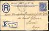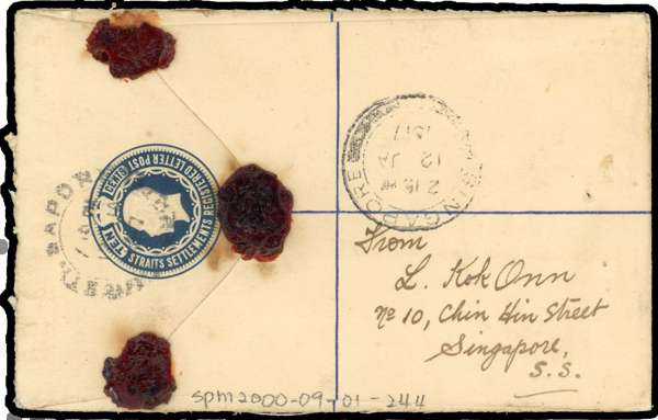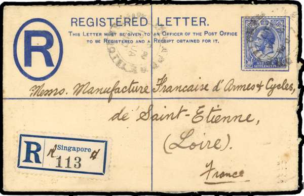 Raffles Hotel. 1917 (12 JA) KGV 10c blue registered P/S envelope (opened on three sides for display), used to France and uprated with 1912-23 8c ultramarine, tied by ‘SINGAPORE / RAFFLES HOTEL' cds (Proud type D2 - additional strike alongside) with blue/white provisional registration label (manuscript ‘R H’ added) at lower left and Singapore transit cds for the same day, fine.