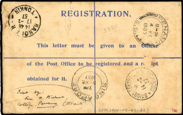 1937 (4 FE) KGV 15c dark blue registered P/S envelope, addressed to Hanoi and insured for $62 (manuscript notation in red ink at foot) with black/pink ‘INSURED / (Valeur Declaree)’ label at upper left, uprated with 1921-33 1c and 1936-37 2c and 12c (2) tied by ‘PULAU TIKUS’ cds (Proud type D2) with blue/white ‘Penang No. S.S. 4’ registration label alongside, backstamped at Penang (4 FE), Singapore (5 FE), Saigon (14 Feb) and Hanoi (17 Feb), a rare usage.