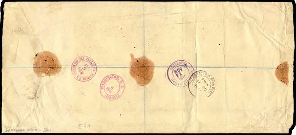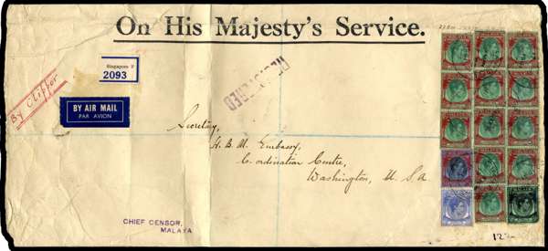 1941 (17 OC) registered airmail OHMS envelope (334 x 151mm) from Singapore to the British Embassy, Washington, endorsed ‘By Clipper’ with violet ‘CHIEF CENSOR / MALAYA’ handstamp at foot, franked at $61.65 ($1.50 per ½oz postage x 41 + 15c registration) by 1937-41 15c (die II), 50c, $1 and $5 (12), tied by SINGAPORE cds (Proud type D187) with registration and airmail labels at left, backstamped at Honolulu (NOV 1) and Washington (NOV 6), sensibly folded for display and typical cover faults, nevertheless a remarkable wartime franking.