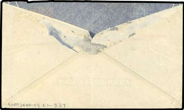 1941 (2 OCT) censored airmail cover to England, typed endorsement ‘BY CLIPPER THROUGHOUT’ and franked by 1937-41 $2 green and scarlet, tied by Indian Army ‘F.P.O. / No 50’ cds (= Fort Canning) with superb triangular ‘PASSED BY CENSOR / (Crown) / No. 3465’ censor mark in violet alongside, lightly folded and flap missing, still a very fine usage.