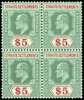 1906-12 $5 green and red/green, wmk MCA, BLOCK OF 4, large part o.g. An attractive and extremely scarce multiple. SG 167, cat £720+