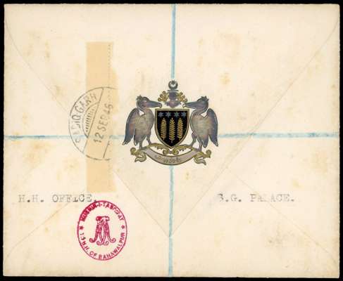 Officials. 1946 registered envelope from Sadiq Garh to Baghdad-ul-Jadid, 12 SEP CDSs, bearing 1945 1a black and carmine vertical pair and 2a black and violet, with ‘From the desk of the Amir’ Urdu handstamp at top left. On reverse, registration selvedge with part Sadiq Garh CDS, State Crest and Mushir-i-Tasrifat handstamp in red. SG O14, O3