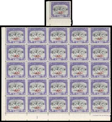 Officials. 1945 2a black and violet lower left corner block of twenty-five with FP 1 and part imprint, fine unmounted o.g., with R6/3 showing the SARKARK variety. A rare positional multiple. Also a hinged o.g. single from the lower left corner, i.e. R10/1, showing the same variety; most unusual. SG O3a