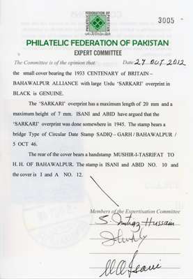 Officials. 1946 envelope bearing 1a Centenary with the large black SARKARI overprint, Sadiq Garh CDS of 5 OCT 46. Sent to a desert fort in Cholistan. State Crest on reverse, with Mushir-i- Tasrifat handstamp. PF Pakistan Certificate (2012), a rare cover