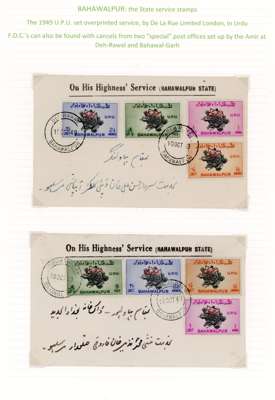 Officials. 1949 UPU FDCs. Three Official covers, cancelled at Sadiqgarh Palace (Imperial PO cancel), Deh-Rawal and Bahawal-Garh (the Amir's ‘Special’ Post Offices); and a Bombay Philatelic Co cover, cancelled 20 JAN 50 at Baghdad up Jadid. SG O28-31