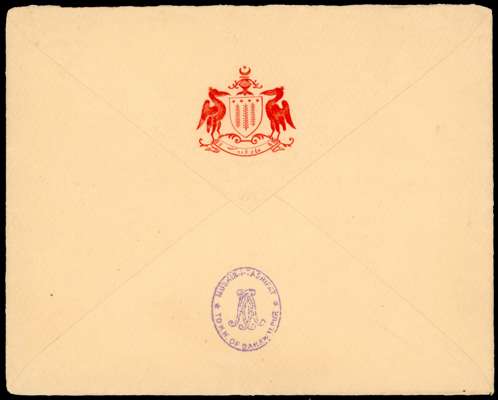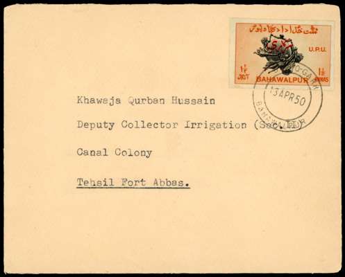 Officials. 1950 envelope to Fort Abbas with UPU 1½a Official imperforate single, tied by Sadiq-Garh CDS of 13 AP 50. State Crest on reverse, with Mushrir-i-Tasrifat handstamp. SG O30 var