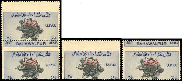 Officials. 1949 UPU 2½a black and blue vertical pair and two singles with a large perforation shift. The pair from the first and second rows of the sheet, the upper stamp with blank area at top and missing BAHAWALPUR at base; the lower stamp with Bahawalpur at top. The singles are the same, from a severed pair. All unmounted o.g., lightly toned. SG O31 var
