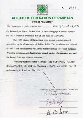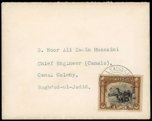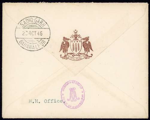 1946 envelope to Baghdad-ul-Jadid bearing the 1933 1a black and brown without overprint (original narrow printing), tied by Sadiq-Garh CDS of 23 OCT 46. State Crest and Mushir-i-Tasrifat handstamp on reverse. A fine, neat cover plainly on official business. PF Pakistan Certificate (2011)