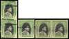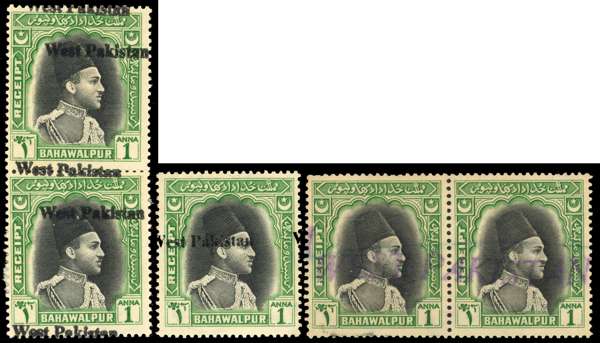 Revenues. 1946 De La Rue 1a black and green Receipt stamps overprinted ‘West Pakistan’. Mint vertical pair (adhesions on reverse) with double overprint; unused single showing overprint shift, and used horizontal pair with large WEST PAKISTAN across the two stamps (applied to pairs after fee increase). Unusual