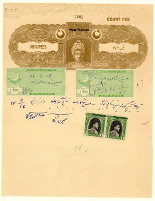 Revenues. 1958 30r stamped paper overprinted ‘West Pakistan’ with added 1a receipt stamp with the same overprint (shifted to right), and two Pakistan 1r Court Fee stamps