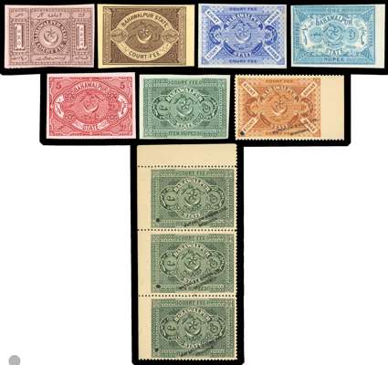 Revenues; Court Fee. 1880 set in imperforate blocks of four, save the 8a which is a block of six, with the right three stamps slightly trimmed at the side. The shades differ from the issued stamps. Also six values imperforate on card, different colours or shades from those issued; 8a overprinted Specimen and punched, imperforate between stamp and margin, and 10r overprinted Specimen and punched vertical strip of three, imperforate between stamps and margin. Unusual