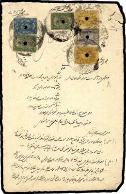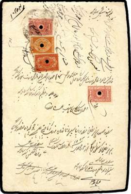 1880 set of eight on three embossed ("blind stamped") documents. punched and cancelled. One with 1a (2), 2a and 4a; the second with 8a (2, one slightly oxidised), 1r (2), 2r and 5r; the third with 10r and scarce
