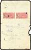 Revenues; Court Fee. De La Rue 20r red and black horizontal pair used on document, each punched. The scarce value, rare in a multiple