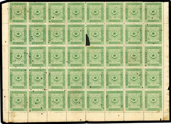 Revenues; Receipt Stamps. 1897 Waterlow 1a green (change to recess printing) damaged block of forty from the base of the sheet, part o.g. 29mm frame height
