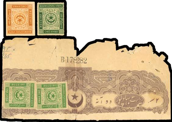Revenues; Receipt Stamps. 1926 1a green, large part o.g., and an imperforate colour trial in orange-brown. Frame height reverts to 30mm; fine. Also a later piece of stamped paper (torn and crudely repaired), with two 1a green showing revised spelling of BAHAWALPUR, one creased