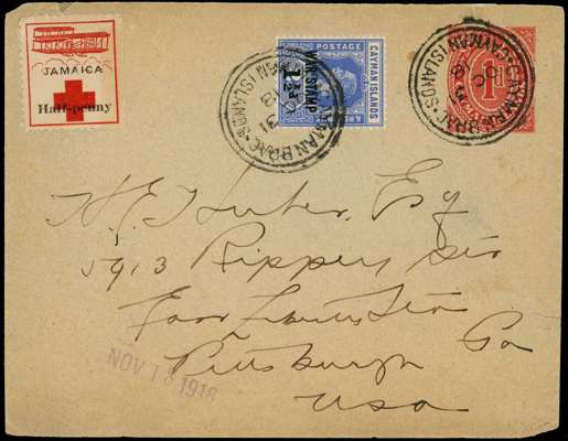 1918 1d Envelope (HG B1) uprated with 1½ d War Tax issue, tied by Cayman Brac cds (31 OC 1918) to USA, additional ½d Jamaica Red Cross Label, small faults, with Kingston, Jamaica transit cancel (5 NO 1918) on reverse