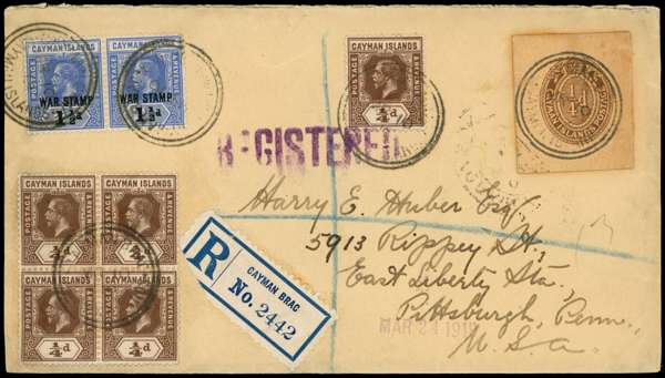 1919 Cut square of ¼d Postal Card used on registered cover to Pittsburgh, alongside five ¼d KGV issues and a pair of 1½ d War Tax issues, cancelled with Cayman Brac cds (10 MR 1919), also Cayman Brac wax seal on reverse
