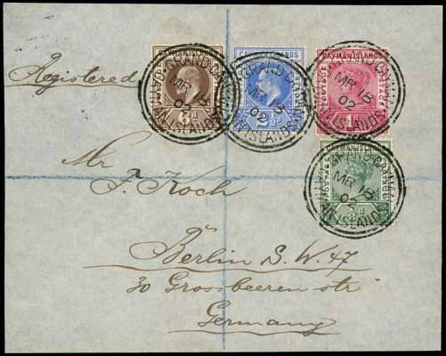 1902 Mixed reign franking on attractive registered cover to Germany, with ½d and 1d QV issues alongside 2½ d and 6d KEVII issues (wmk Crown CA), all with full strikes of Grand Cayman cds (18 MR 1902). Berlin arrival cancel on reverse, fine