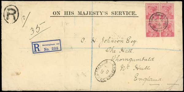 1907 Large OHMS cover to Hull, England with block of four of the 1d QV issue cancelled with central Georgetown cds (19 SP 1907), light vertical fold not affecting the stamps, some wrinkling which does affect the stamps, not surprising give its size, Birmingham registration label on face, Burstwick arrival cds on reverse, ex Watkin, Meredith