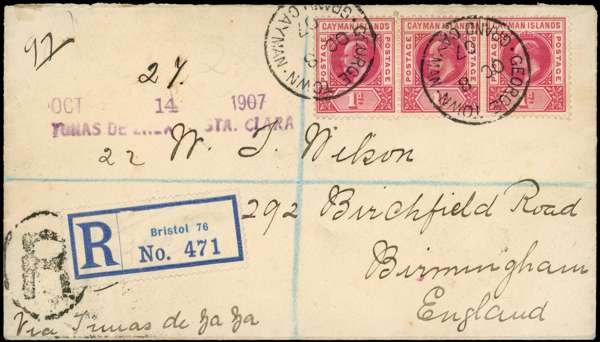 1907 Registered cover franked with three 1d KEVII carmine issues, cancelled with Georgetown cds (8 OC 1907), addressed to Birmingham. Routed via the wonderfully named Tunas de Za Za and Havana Cuba, Bristol registration label on face and transit and arrival marks on reverse.