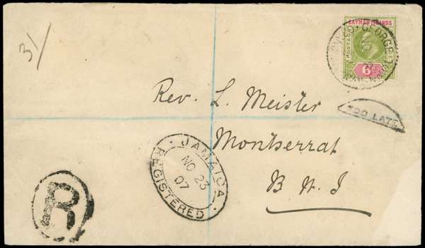 1907 Registered cover to Montserrat bearing a 6d KEVII bi-colour tied with a Georgetown cds (9 NO 1907), with added interest of a "Too Late" handstamp applied en route in Jamaica, Montserrat arrival cancel on reverse (26 DE 1907), fine