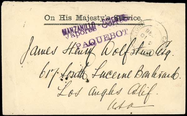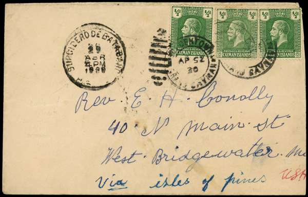 1907-30 Overseas mail routed via Cuba: 1907 registered to New York with pair of 1d and 2½ d KEVII issues routed via Batabano, Cuba. 1920 to Kingston, Jamaica unusually routed via Nueva Gerona, Cuba. 1928 unfranked OHMS cover to Los Angeles with Manzanillo Paquebot mark. 1930 to USA from Boddentown, endorsed "Via Isles of Pines" but routed via Batabano, some flaws but a scarce and interesting group, (5 items)