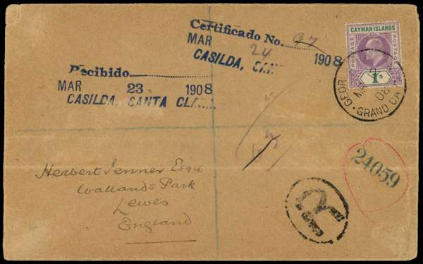 1908 Interesting routeing on this registered cover to England, bearing a 1s violet and green KEVII cancelled with Georgetown cds (12 MR 1908). Routed via Casilda (23 MR) and Havana, Cuba (25 MR, on reverse), then on to Birmingham, London and Lewes (7 AP). Horizontal fold not affecting stamp, scarce franking