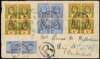 1908 Registered cover to Barbados with an impressive franking of two blocks of four 4d black and red on yellow KEVII issues and a block of four and pair 2½ d ultramarine KEVII issues, all cancelled by Georgetown cds (16 AP 1908). Barbados arrival (19 MY 1908) on reverse, part of back torn away