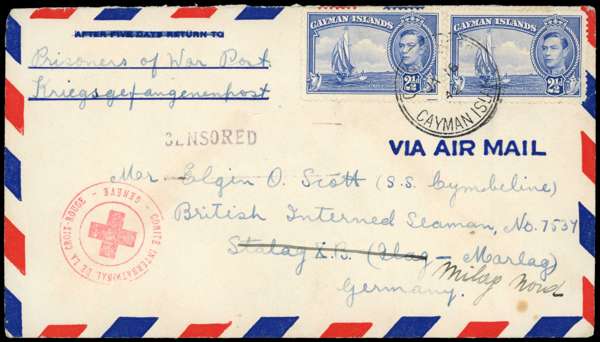 1942 Prisoner of War mail to a British Interned Seaman at Stalag X.B., Germany (re-addressed), franked with two 2½ d KGVI issues cancelled at Cayman Brac (16 JA 1942), with "CENSORED" handstamp (CH2) and Red Cross - Geneva handstamp, fine and rare