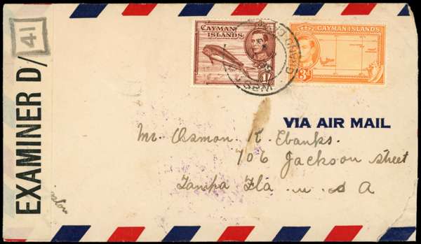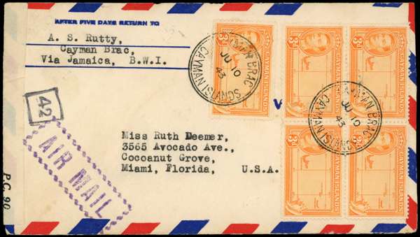 1943 Five censored covers addressed to the US, each with Jamaican censor labels used in the Cayman Islands, four with CH6 and CH7 handstamps and one with a manuscript "41" in blue pencil. Two with boxed "41" handstamps (one with an attractive patriotic cachet). Two with boxed "42" handstamps sent from Cayman Brac to New York, and other to Miami, useful selection (5 items)