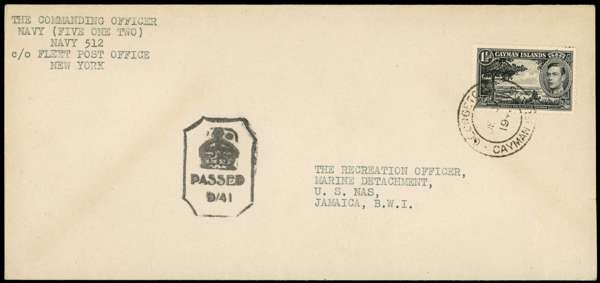 1944 US Military based in the Cayman Islands (anti-submarine air patrol), US Navy station 512, addressed to the US base in Jamaica, with octagonal crown "PASSED D/41" (CH4) on face, fine and scarce