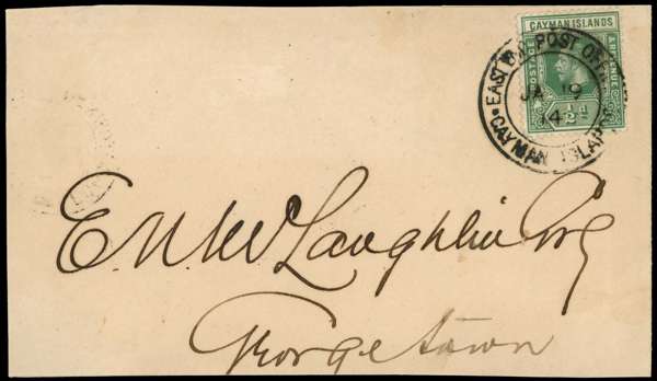 1914 East End (type 2, 19 JA 1914) on ½d rated local cover addressed to Georgetown (½d KGV issue), reduced at left and top, Boddentown cds (20 JA 1914) and Georgetown arrival cds (21 JA 1914) on reverse, ex Watkin, Edmondsen, scarce cancel