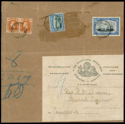 1923 Incoming Parcel Post piece from Jamaica, likely from a parcel of books, franked with 9d in Jamaican stamps. This was deficient as a pair of 1½ d KGV issues were added as Postage Dues on arrival (9 MY 1922). Ex Watkin, a rare combination item