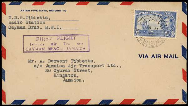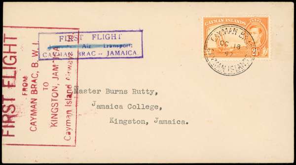 1947 Cayman Island Airways Ltd., group of ten first flight covers with various cachets and dates, including: "FIRST FLIGHT, Jamaica Air Transport, CAYMAN BRAC- JAMAICA" handstamp in purple (AM4Ba), on cover from Cayman Brac (11 JA 1947) to Jamaica. Large boxed "FIRST FLIGHT FROM GRAND CAYMAN, B.W.I. TO KINGSTON, JAMAICA" in purple, Cayman Island Airways, Ltd." on cover from Georgetown (4 JU 1948) to Jamaica. Cayman Brac (18 OC 1948) to Jamaica with "FIRST FLIGHT, Jamaica Air Transport (crossed out in blue pencil), CAYMAN BRAC- JAMAICA" handstamp in purple (AM4Bb), also large boxed "FIRST FLIGHT FROM CAYMAN BRAC, B.W.I. TO KINGSTON, JAMAICA, Cayman Island Airways, Ltd." in red ink, similar from Little Cayman (4 OC 1947) etc.